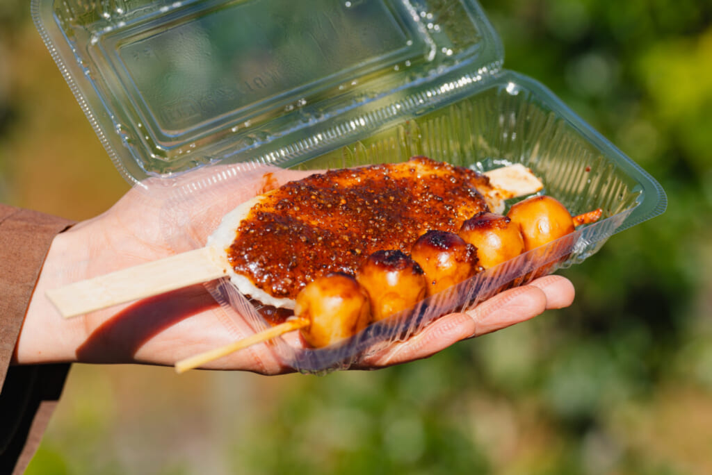 道の駅明宝横の「花の里」駐車場内のテイクアウトのお店。メニューは、えごまの五平餅、醤油味のみだらしだんご、ソフトクリーム各種、かき氷各種です。